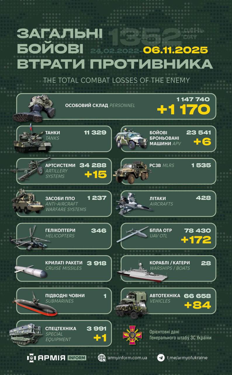 Отже, загальні бойові втрати противника з 24.02.22 по 06.11.25 орієнтовно становлять: