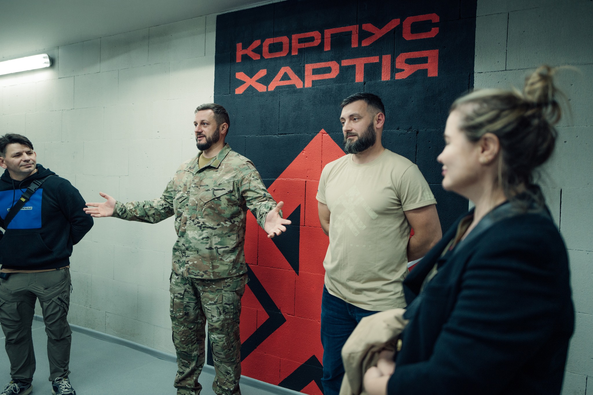 Командир корпусу Ігор «Корнет» Оболєнський та перший заступник командира — начальник штабу корпусу Максим «Альтаїр» Голубок ознайомили високоповажних гостей із принципами роботи, організаційною структурою та бойовими підходами підрозділів «Хартії».
