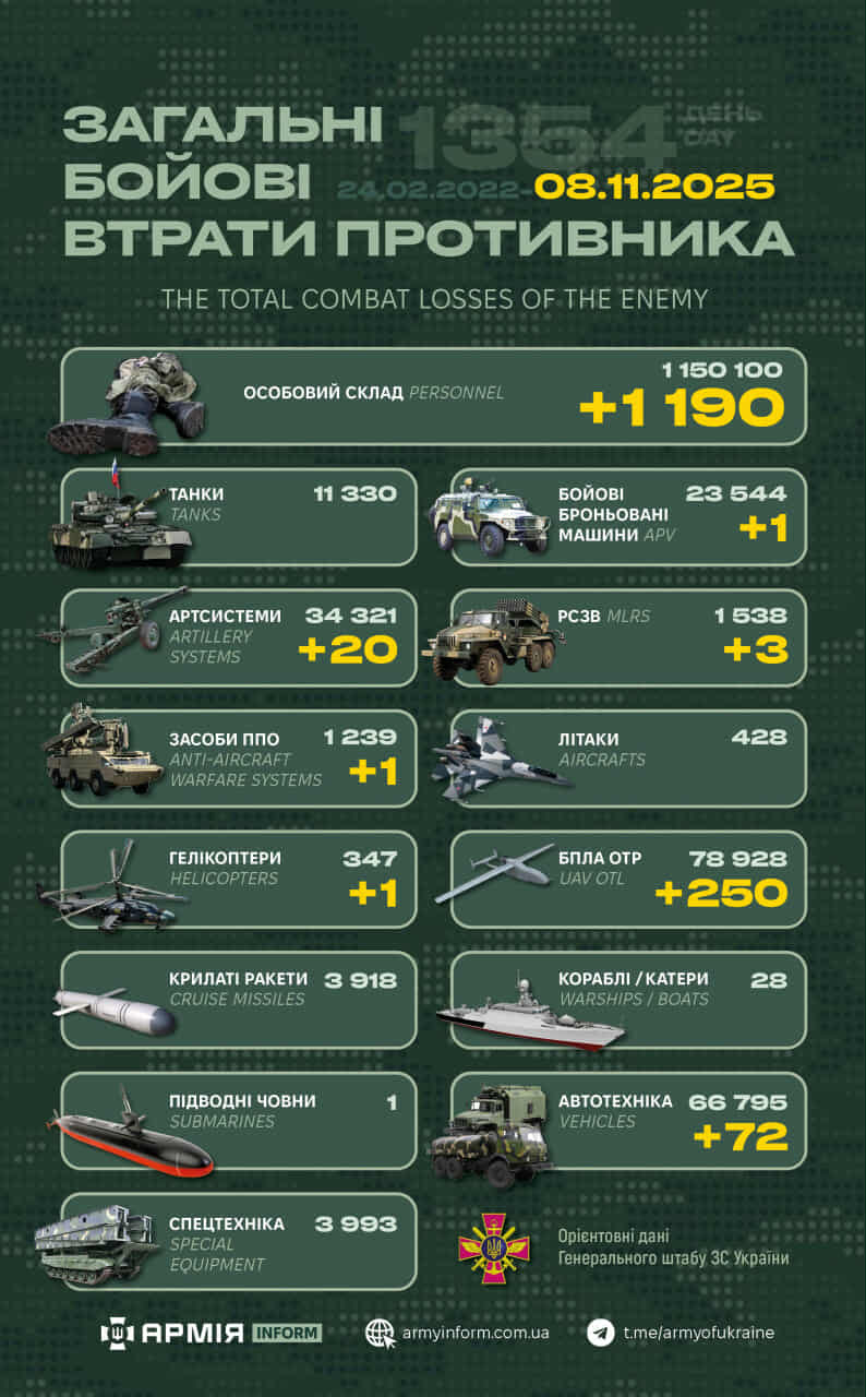 Таким чином загальні бойові втрати противника з 24.02.22 по 08.11.25 орієнтовно становлять: