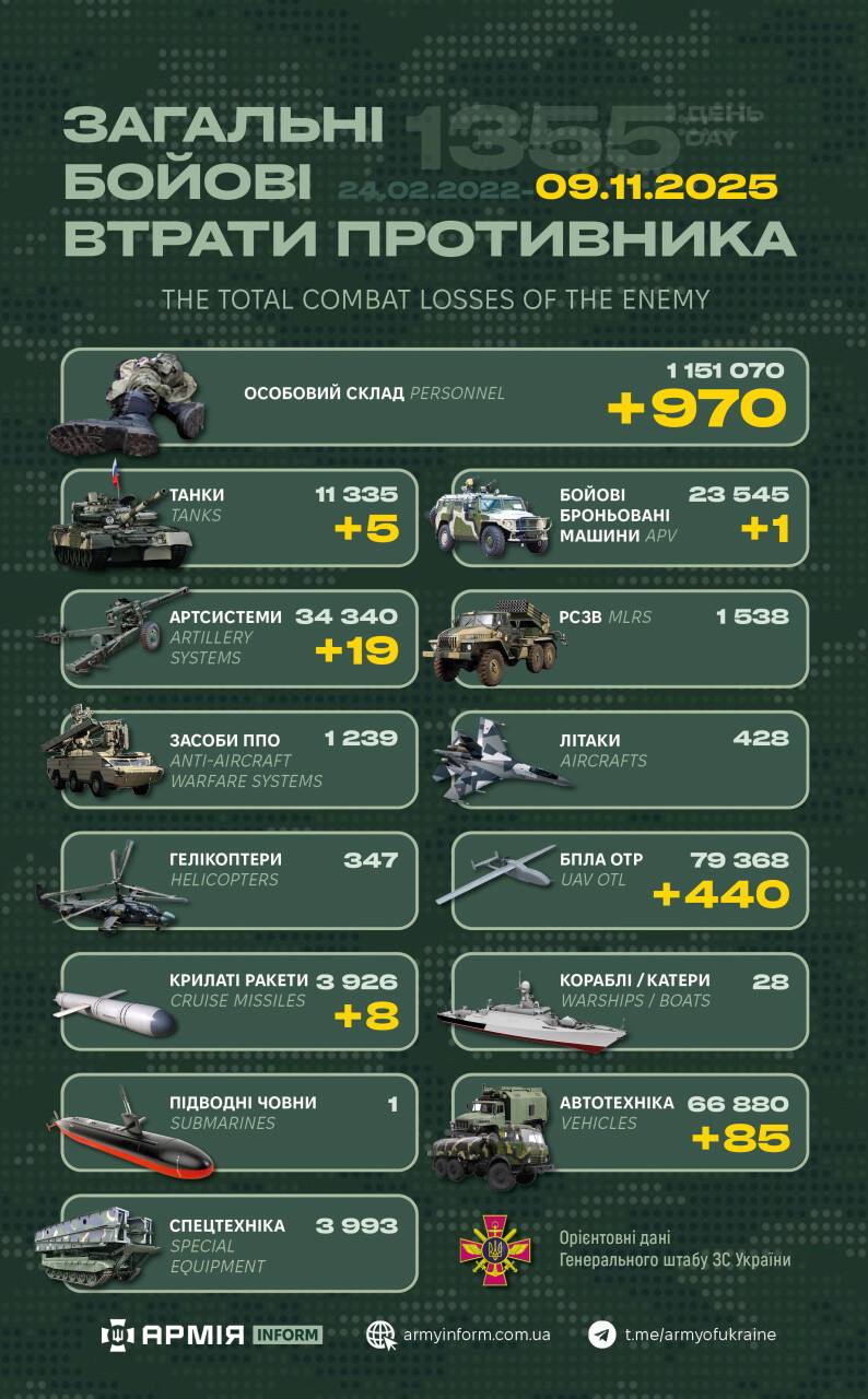 Загальні бойові втрати противника з 24.02.22 по 09.11.25 орієнтовно становлять: