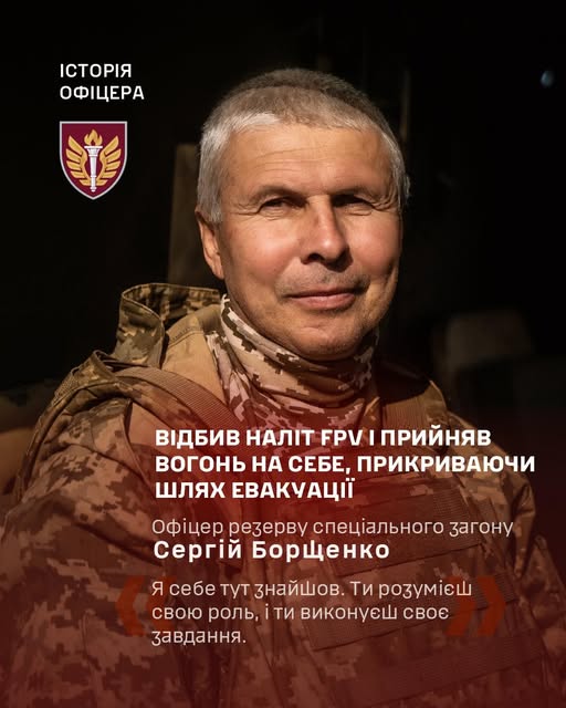 Офіцер резерву спеціального загону Десантно-штурмових військ ЗСУ Сергій Борщенко під час виконання бойового завдання взяв вогонь на себе, прикривши евакуаційну групу. Під час бою дістав важке поранення щелепи, але вижив — і після тривалого лікування знову повернувся у стрій.