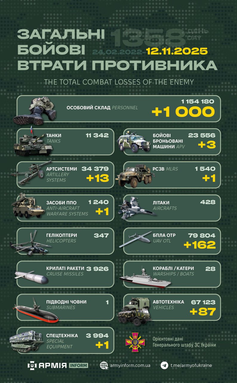 Загальні бойові втрати противника з 24.02.22 по 12.11.25 орієнтовно склали:
