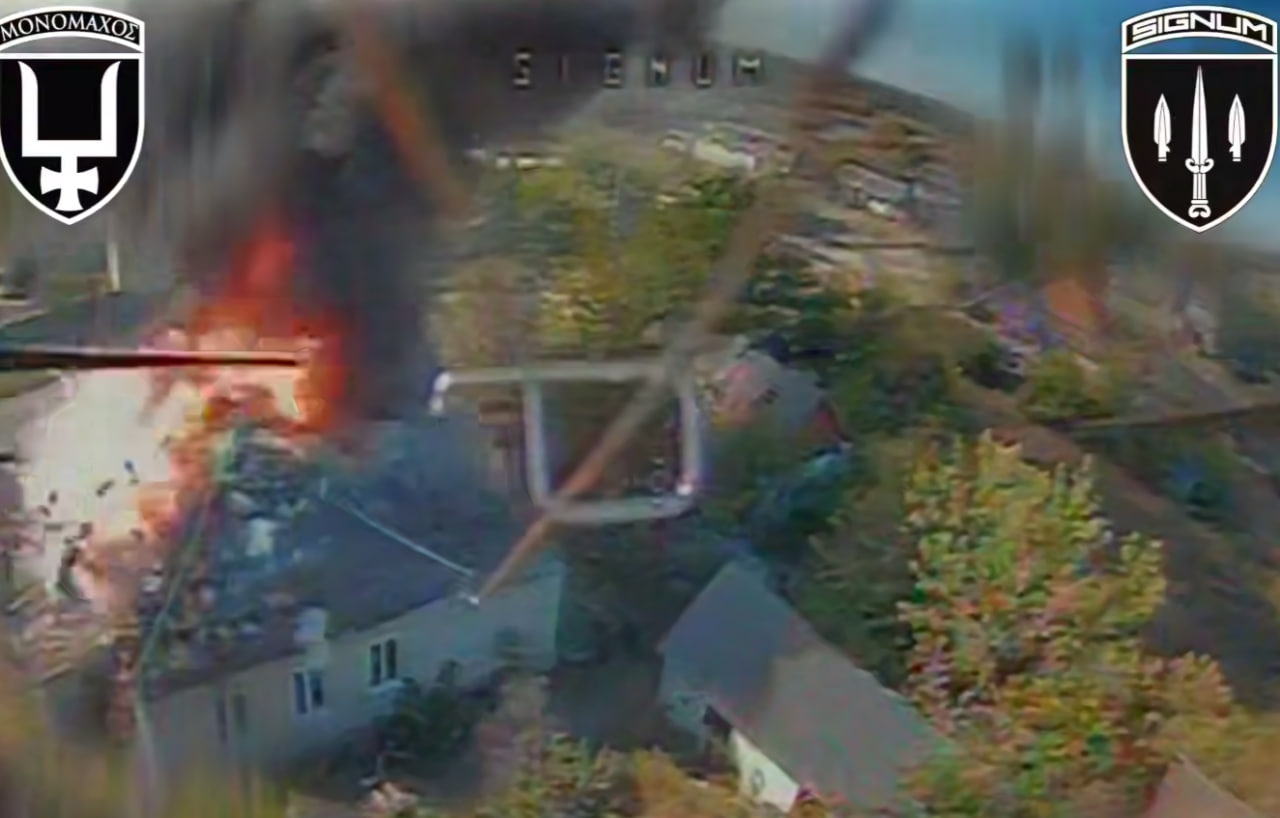 Батальйон Signum показав спільну роботу артилерії та FPV-дронів по скупченню ворога. На відео — момент, коли снаряд влучає в палаючий будинок, де ще перебували окупанти.