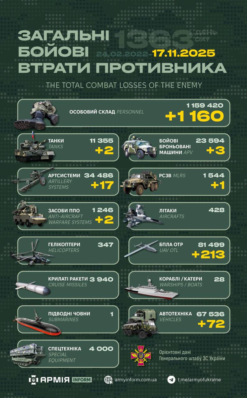 Загальні бойові втрати противника з 24.02.22 по 17.11.25 орієнтовно склали: