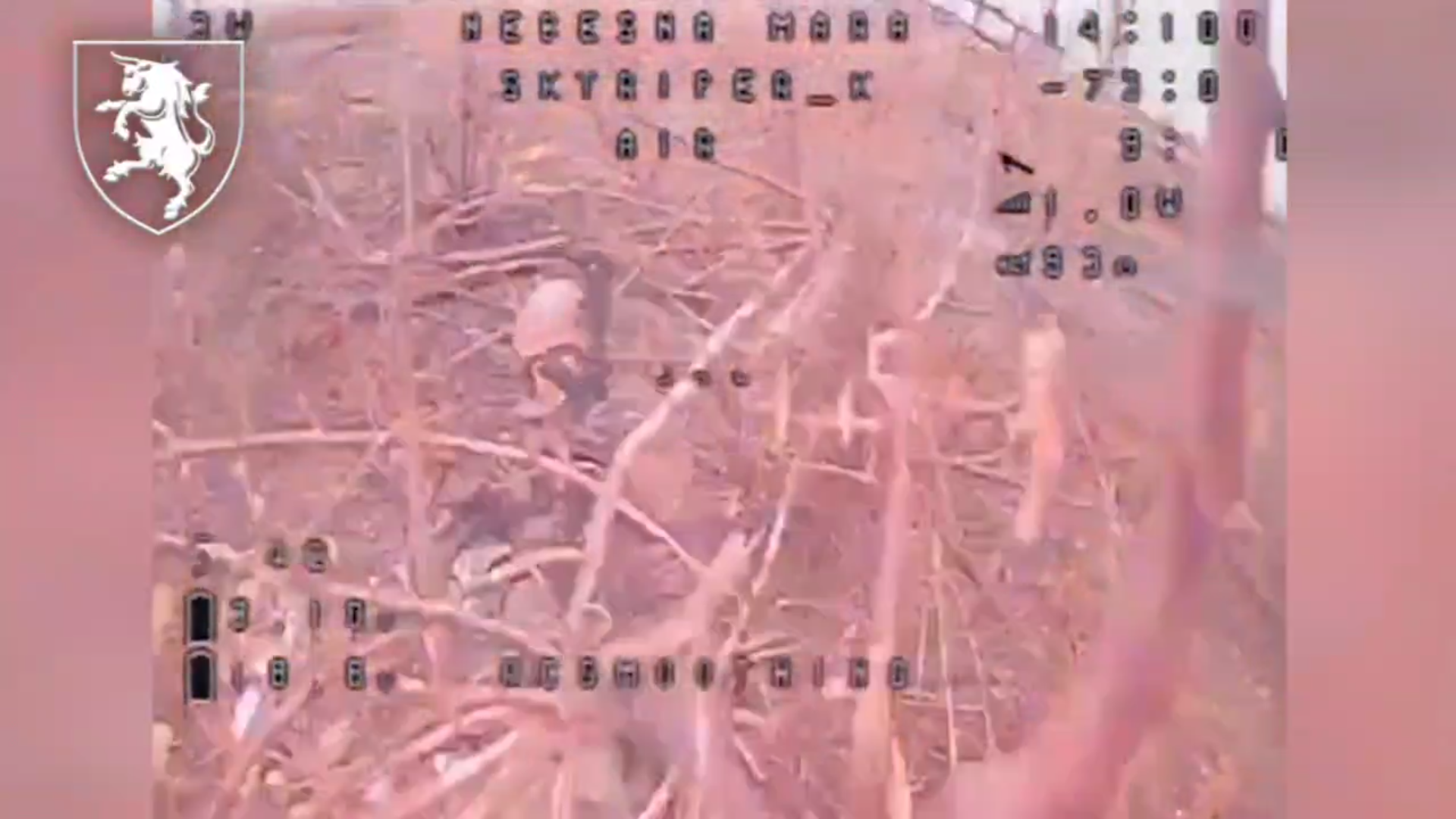 Пілоти 43 механізованої бригади змогли помітити російського штурмовика, який заліз під купу гілок, коли помітив наближення дрона.