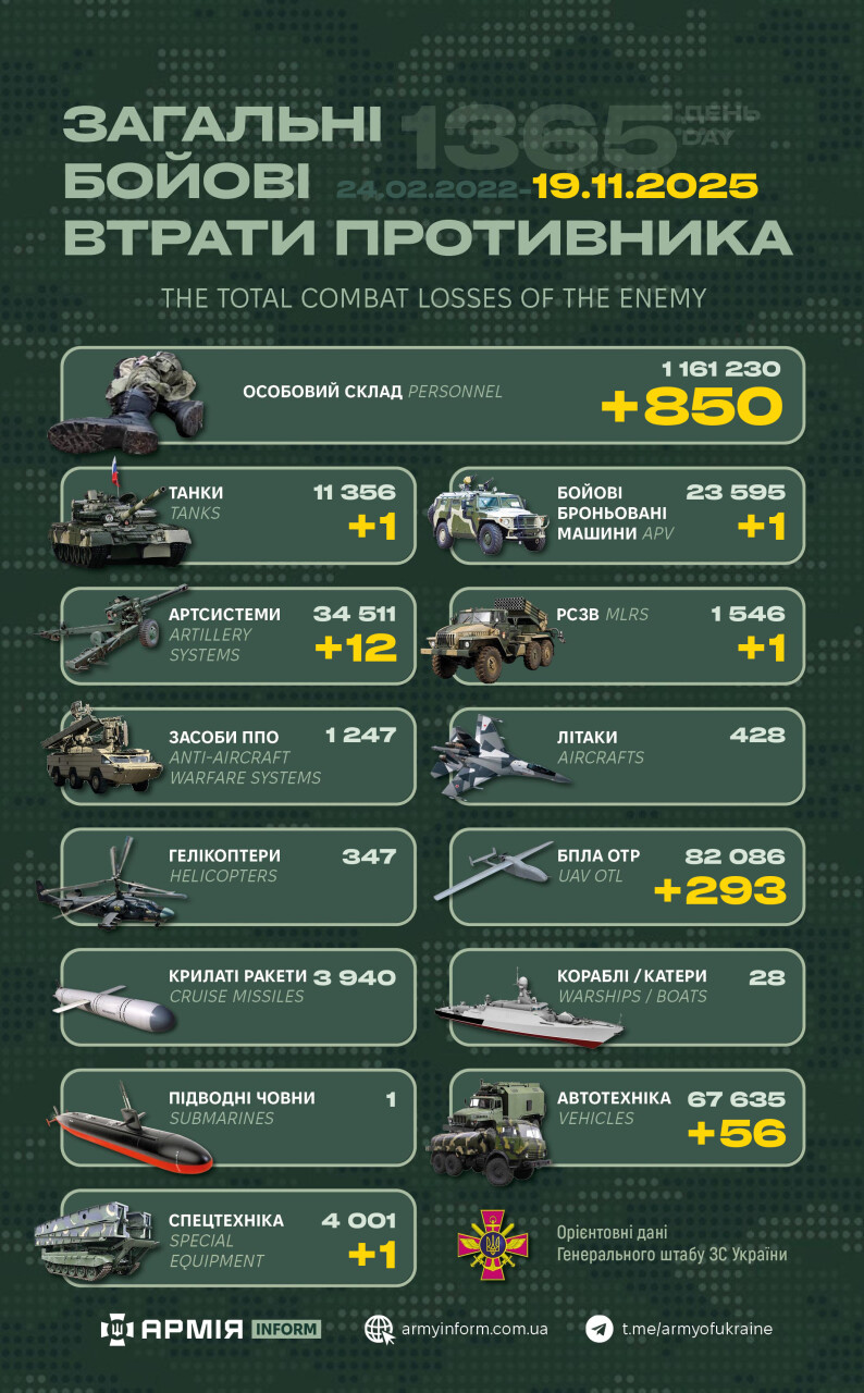 Дані про це оприлюднив 19 листопада Генеральний штаб ЗСУ.