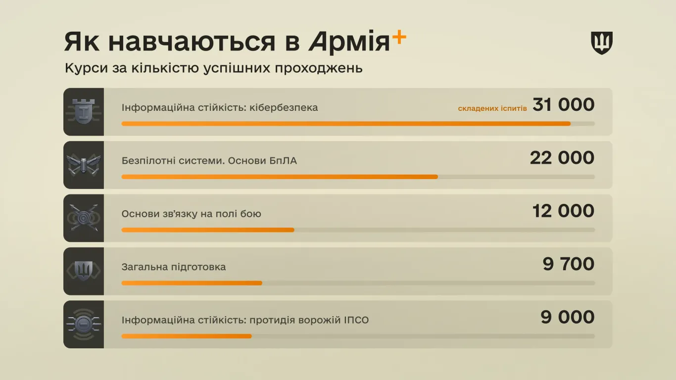 Майже половина військовослужбовців (45%), які починають один із навчальних курсів в Армія+, проходять його до кінця та успішно складають іспит. А найпопулярнішими є курси із серії про інформаційну стійкість: «Кібербезпека» та «Протидія ворожій ІПСО».