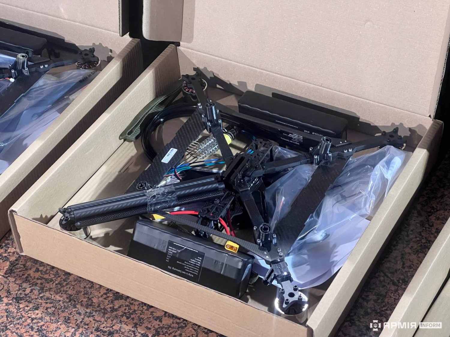 Головне управління розвідки Міністерства оборони України отримало чергову партію ударних дронів, придбаних за кошти, зібрані в межах всеукраїнської ініціативи «Смачно, бо на дрони», організованої благодійним фондом «Сучасна Україна». Благодійникам вдалося зібрати понад 2,5 млн грн, що дозволило закупити 50 Secret Box-ів з дронами на оптоволокні та бойовими частинами.