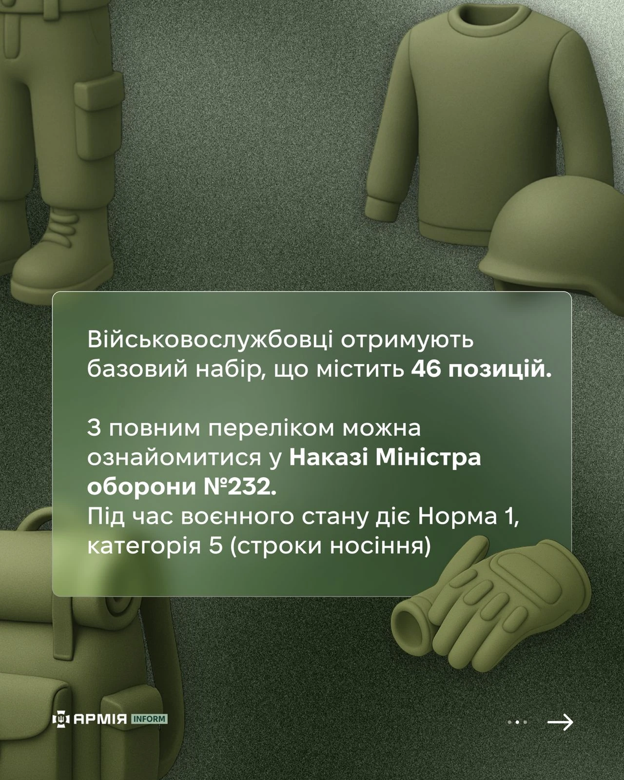 Військовослужбовці отримують базовий набір, що містить 46 позицій. З повним переліком можна ознайомитися у Наказі Міністра оборони № 232. Під час воєнного стану діє Норма 1, категорія 5 (строки носіння).