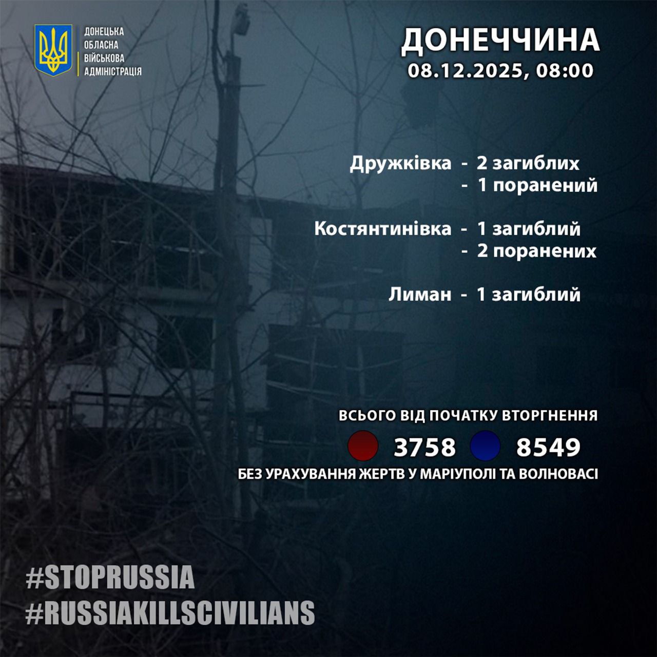 За його даними, 7 грудня росіяни вбили 4 жителів Донеччини: двох у Дружківці, по одного в Костянтинівці та Лимані.