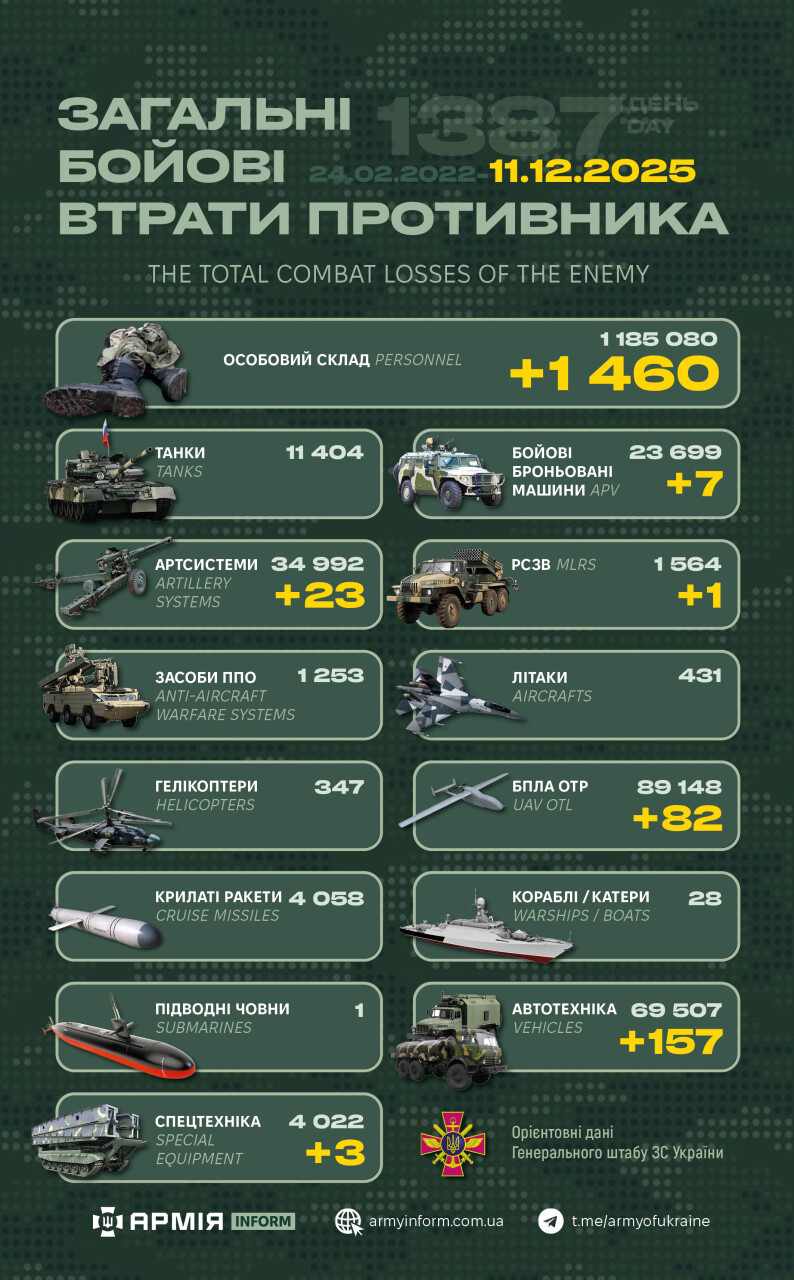 Загальні бойові втрати противника з 24.02.22 по 11.12.25 орієнтовно становили: