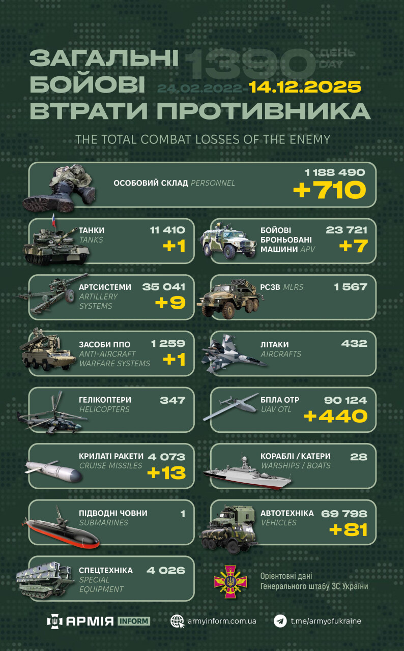 Загальні бойові втрати противника з 24.02.22 по 14.12.25 орієнтовно становили: