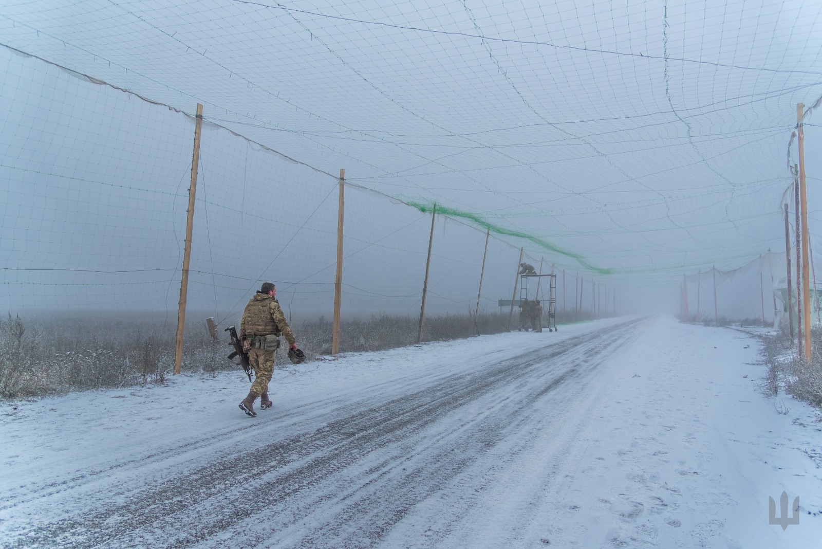 У прифронтовій зоні військові інженери 116-ї окремої механізованої бригади продовжують облаштовувати захисні сітки над маршрутами руху техніки та особового складу.