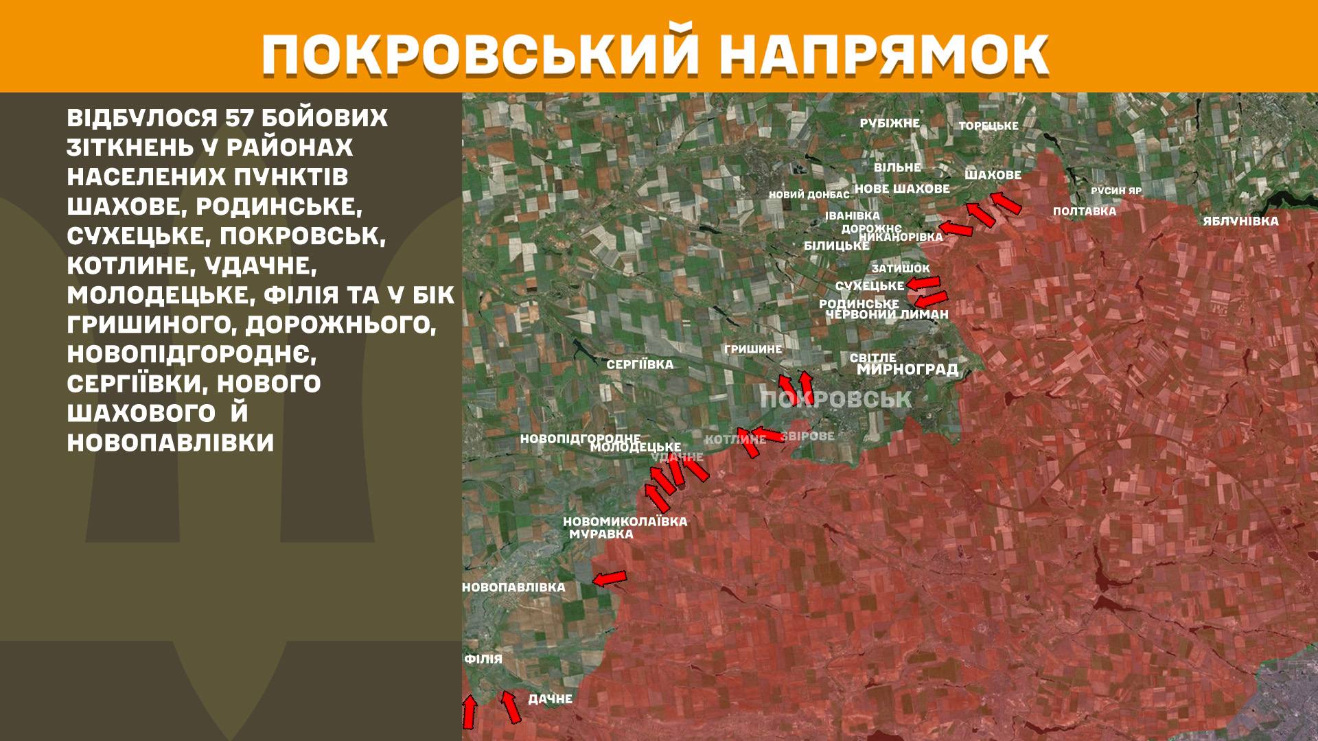 На Покровському напрямку відбулося 57 бойових зіткнень у районах населених пунктів Шахове, Родинське, Сухецьке, Покровськ, Котлине, Удачне, Молодецьке, Філія та у бік Гришиного, Дорожнього, Новопідгороднє, Сергіївки, Нового Шахового й Новопавлівки.