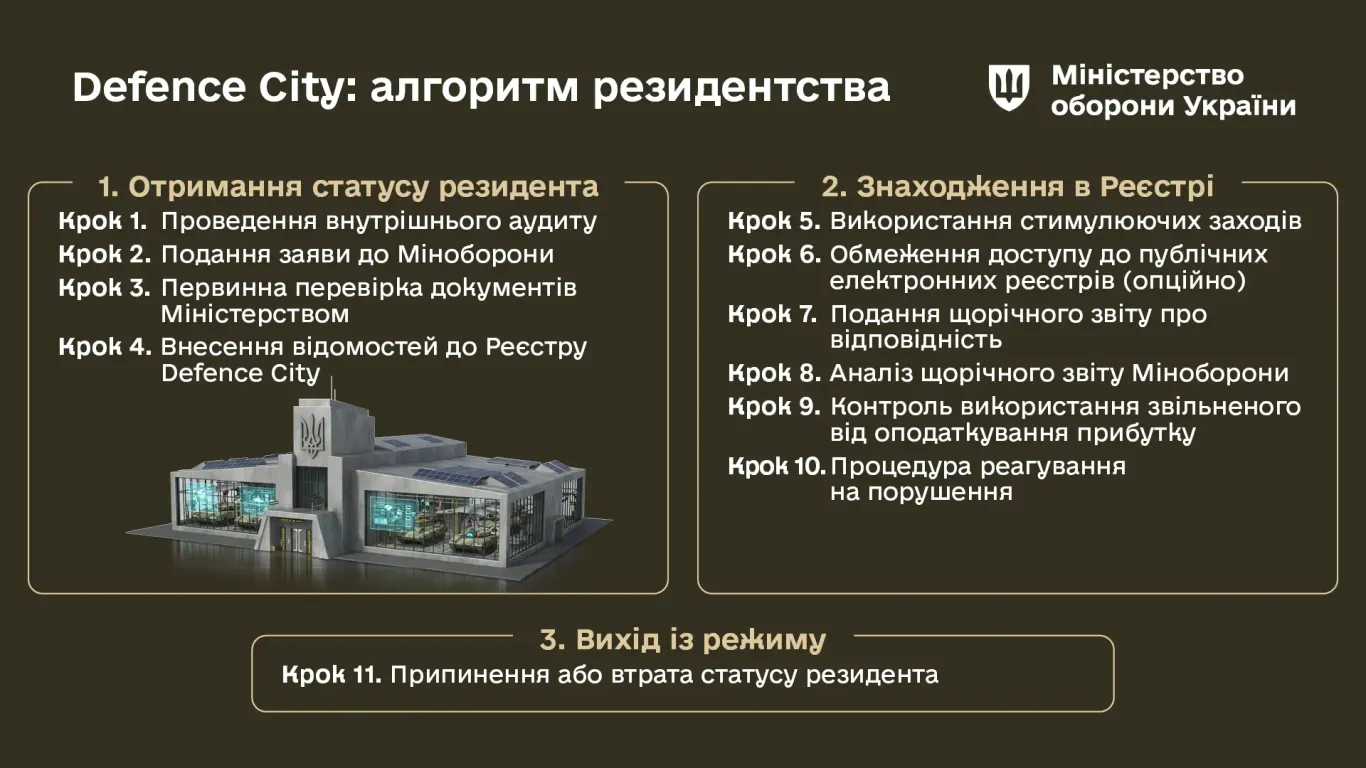 З дня ухвалення рішення Міноборони та внесення запису до реєстру Defence City підприємство набуває статусу резидента Defence City.