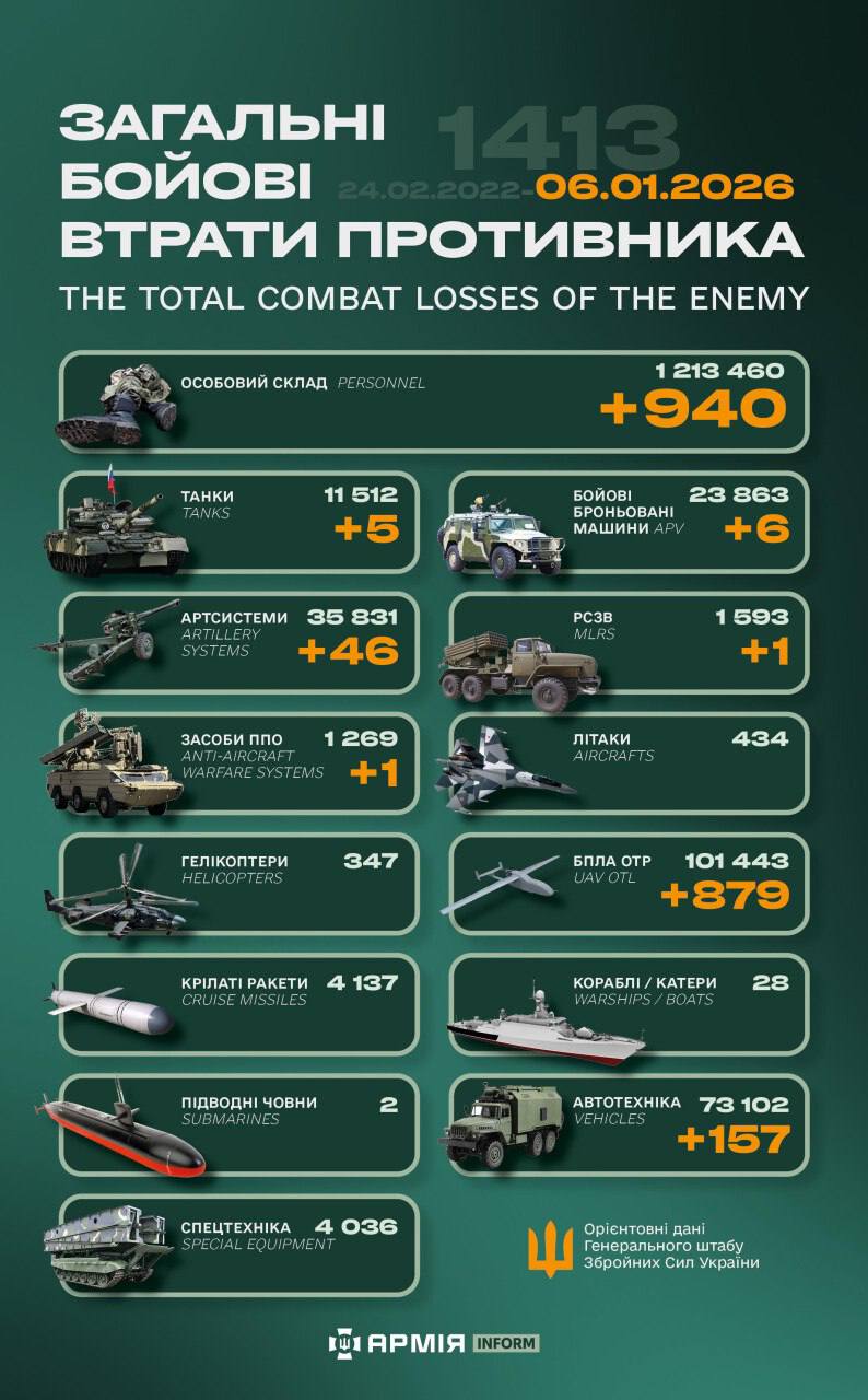 Загальні бойові втрати противника з 24.02.22 по 06.01.26 орієнтовно становили: