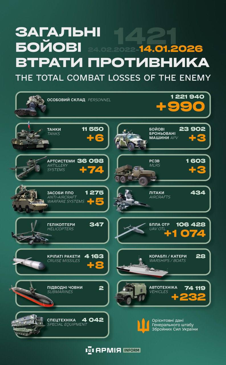 Загальні бойові втрати противника з 24.02.22 по 14.01.26 орієнтовно становлять: