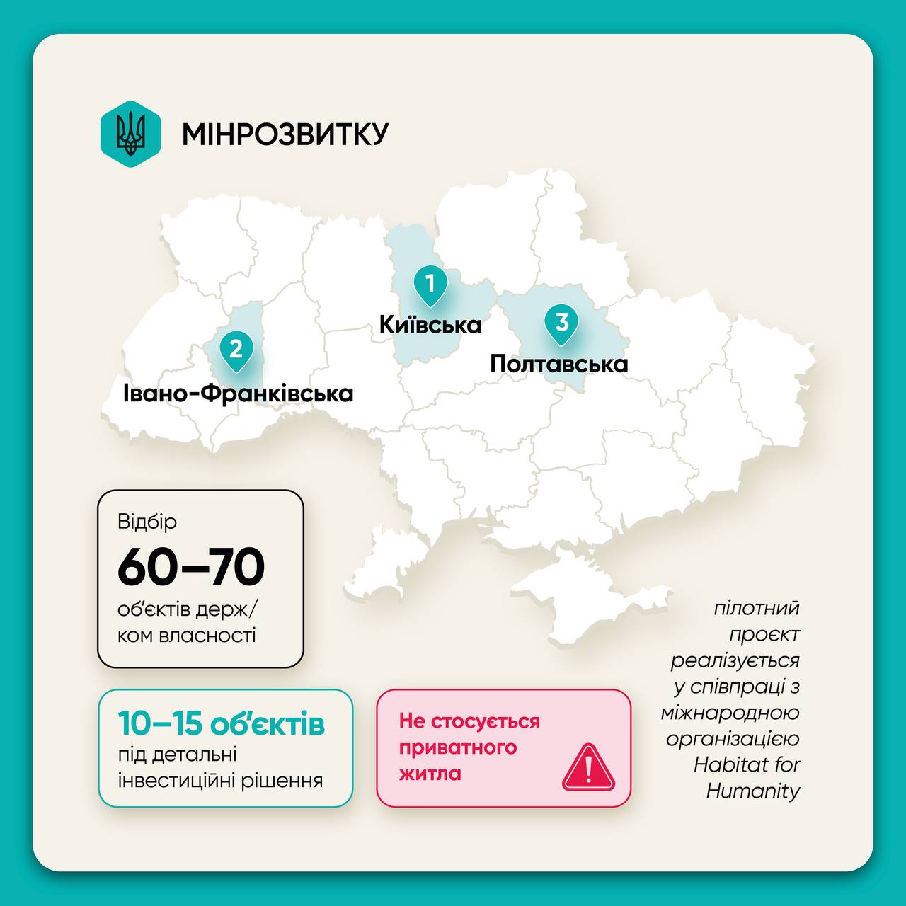 Проєкт реалізується на виконання Закону №4080. На першому етапі — пілот у трьох областях: Київській, Івано-Франківській та Полтавській. Триває відбір 60–70 об’єктів. Із них для підготовки детальних інвестиційних рішень відберуть 10–15, де реконструкція є технічно та економічно обґрунтованою.