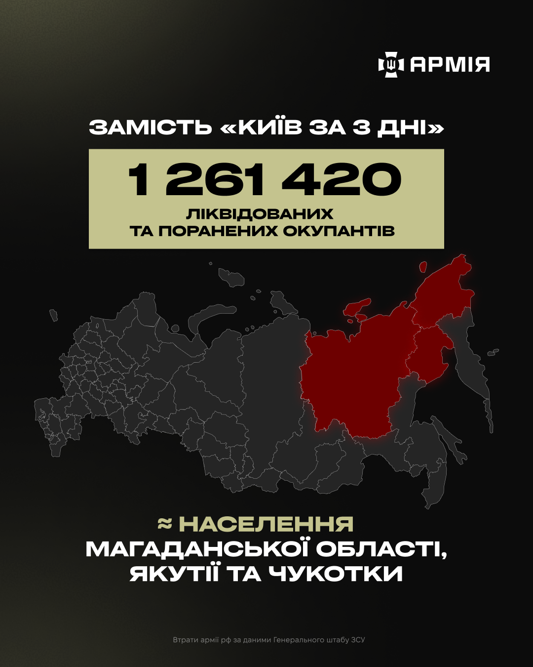 За чотири роки великої війни російська армія втратила в Україні 1 мільйон 260 тисяч військових. Це кількість населення Казані, чотирьох таких міст, як Белгород, або трьох таких регіонів, як Магаданська область, Якутія та Чукотка, що займають 25% території рф.