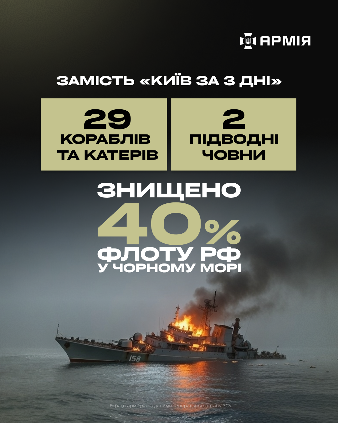 Україна вразила 29 російських кораблів та катерів, а також два підводні човни. Майже кожен другий російський корабель у Чорному морі був уражений чи втрачений.