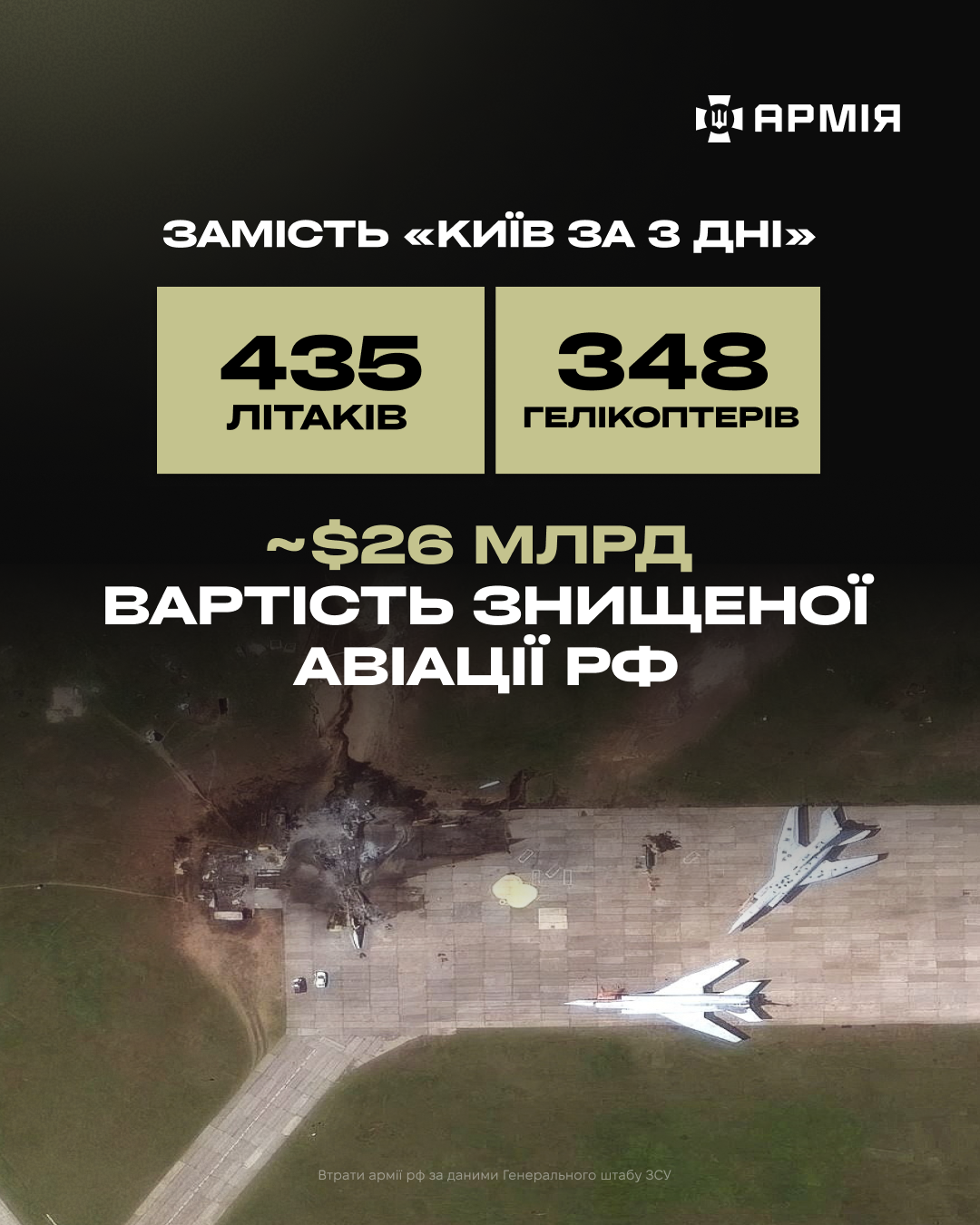 За чотири роки росіяни втратили 435 військових літаків різних типів: штурмовики Су-25, винищувачі Су27/Су-30 та МіГ-29, фронтові бомбардувальники Су-34, транспортні Ан-26 тощо.