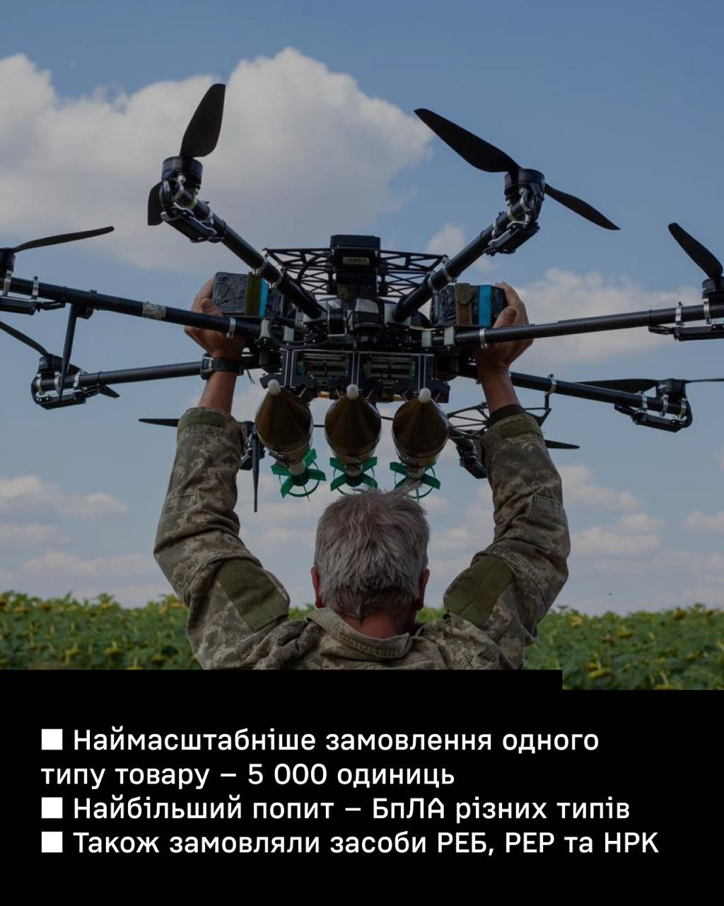 Найбільше замовлення становить 5000 одиниць одного типу товару. Найчастіше замовляють БПЛА та засоби радіоелектронної боротьби і розвідки.