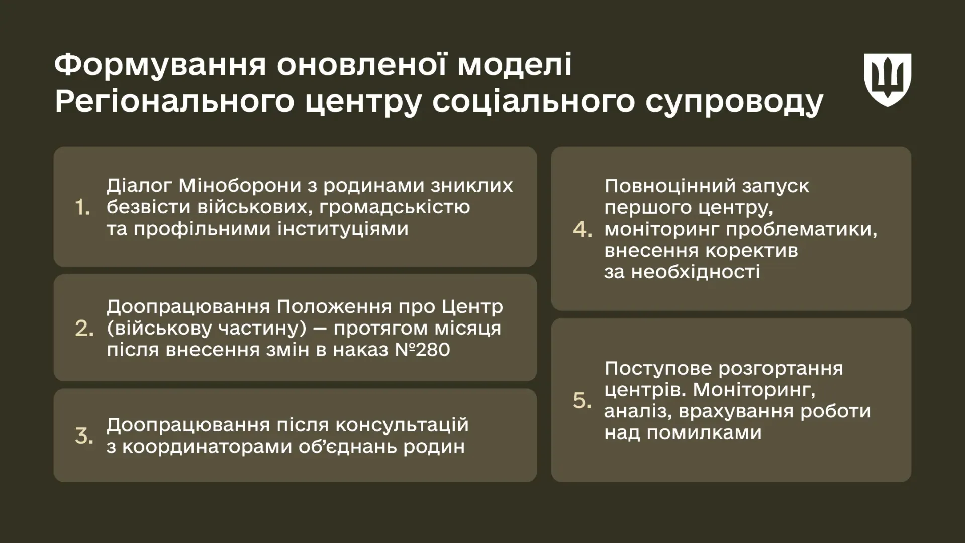 Створення регіональних центрів соціального супроводу покликане забезпечити централізований облік зниклих безвісти військових, гарантувати безперервність фінансових виплат та мінімізувати бюрократичні труднощі для родин захисників.