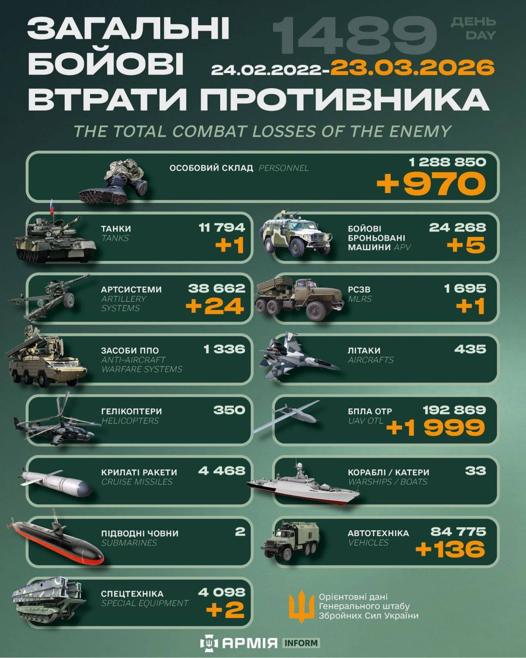Загальні бойові втрати противника з 24.02.22 по 23.03.26 орієнтовно становили: