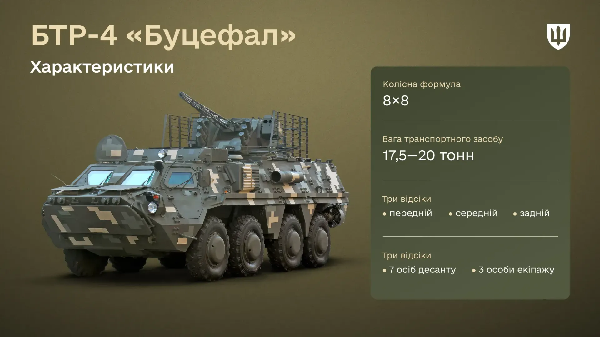 БТР-4 «Буцефал» — бронетранспортер із колісною формулою 8×8. Однією з головних особливостей є трисекційна схема, яка кардинально відрізняє його від застарілих БТР-70/80.