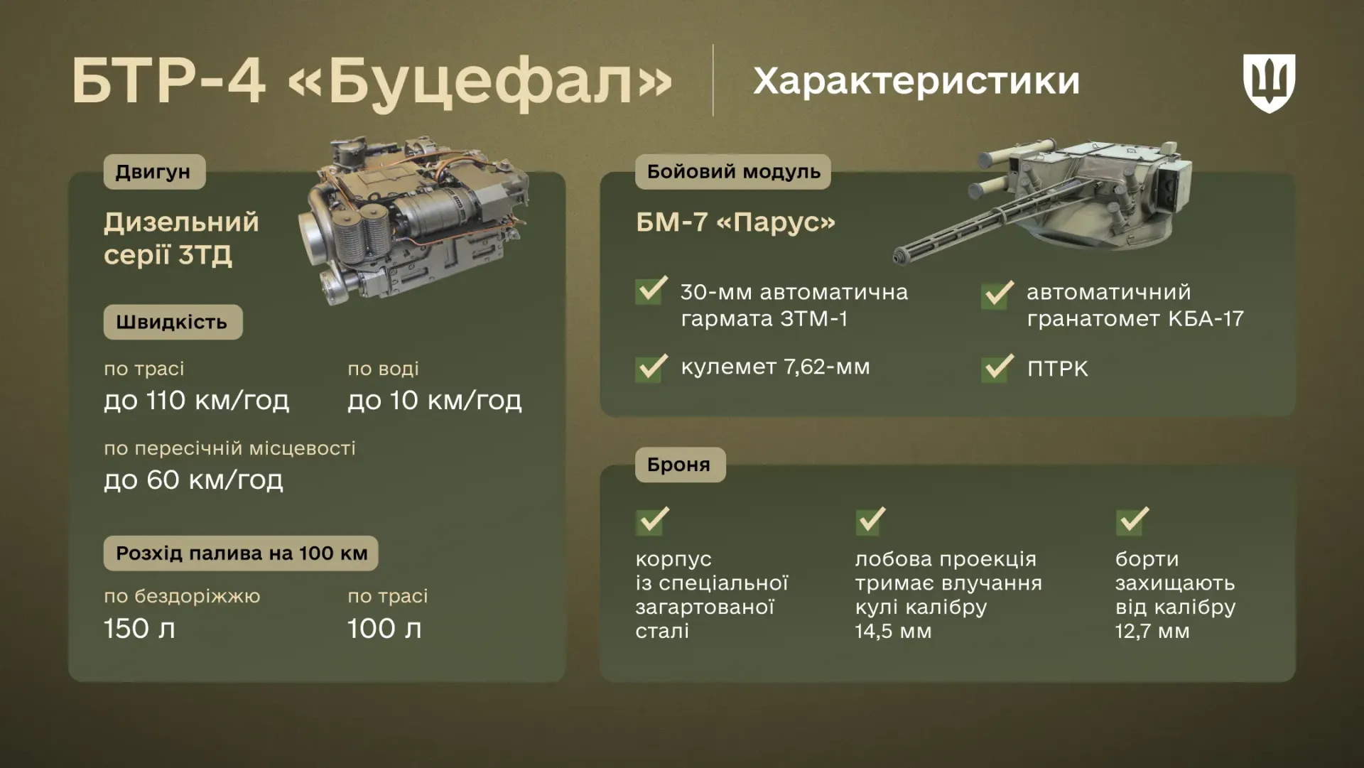 Під капотом «Буцефала» працює український дизельний двигун серії 3ТД. Він гучний, але компактний.