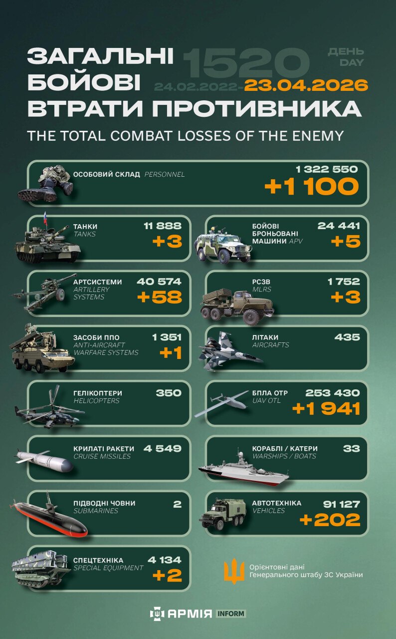 Загальні бойові втрати противника з 24.02.22 по 23.04.26 орієнтовно становили: