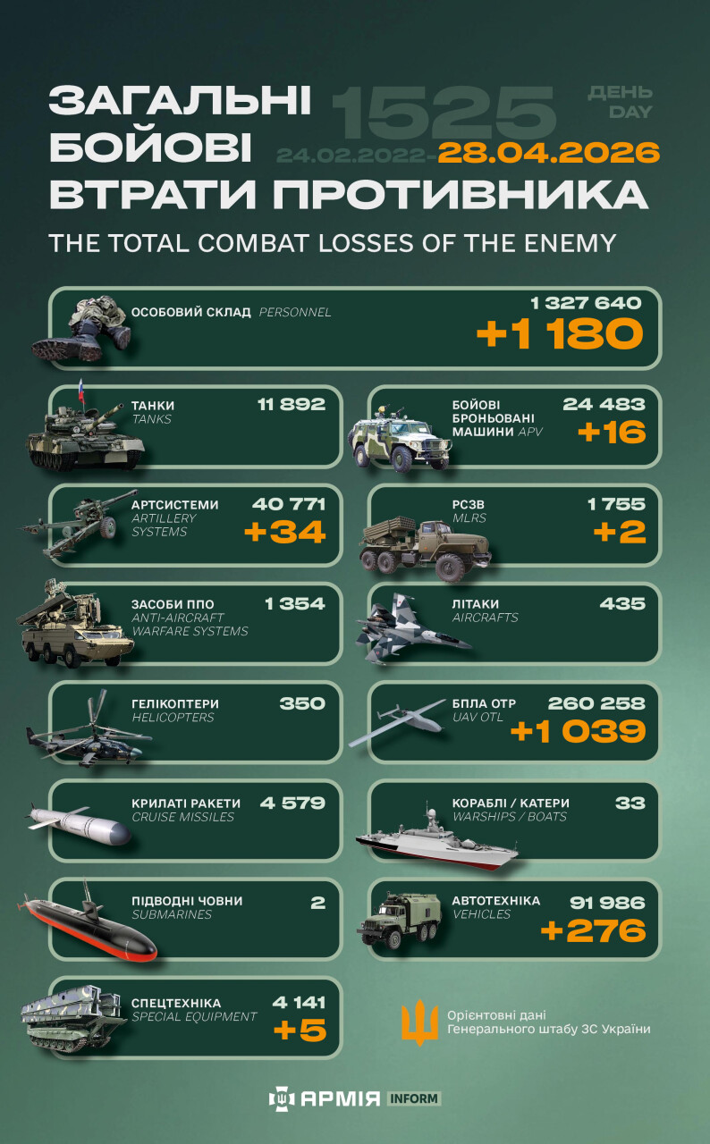 Загальні бойові втрати противника з 24.02.22 по 28.04.26 орієнтовно становили: