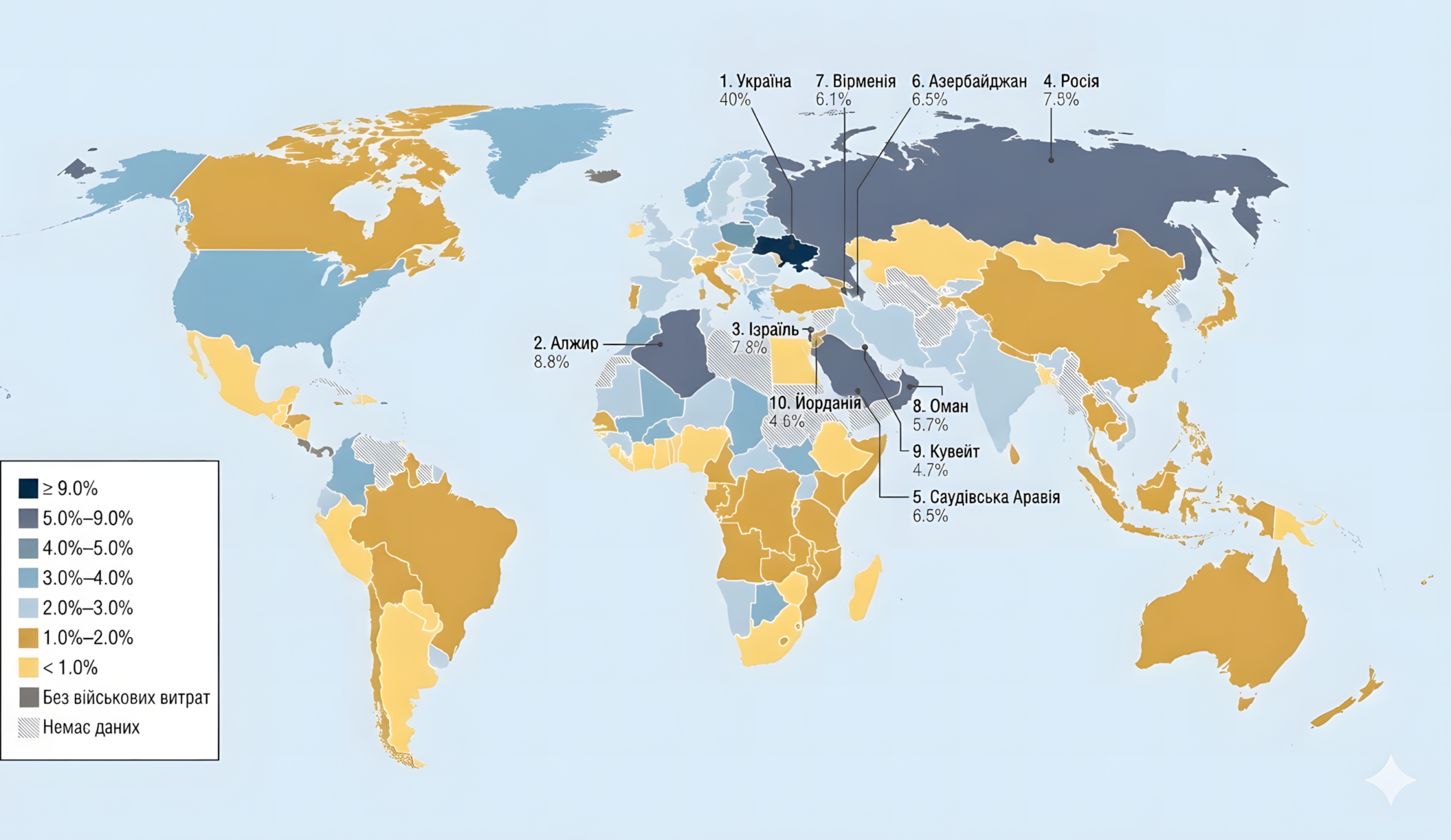 Топ-5 країн за витратами — США ($954 млрд), Китай ($336 млрд), Росія ($190 млрд), Німеччина ($114 млрд) та Індія ($92,1 млрд) — разом вони становлять 58% світових оборонних видатків.