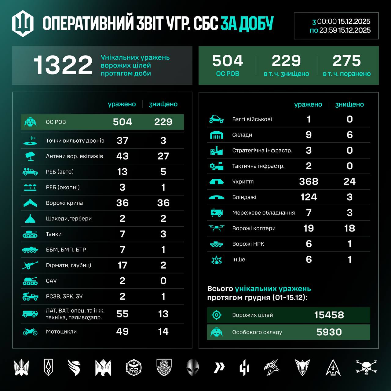Over the course of December 15, 504 Russian soldiers were hit, including 229 killed and 276 wounded.
