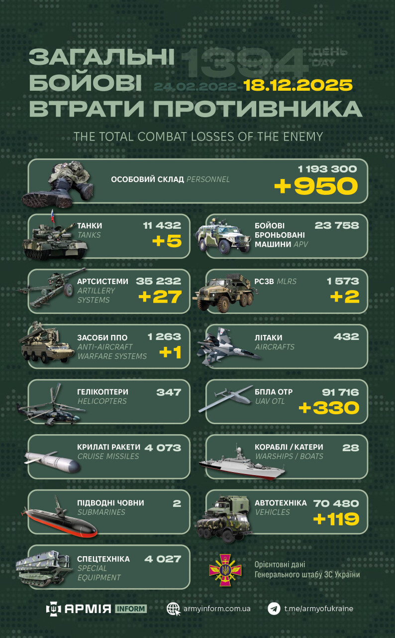 The total combat losses of the enemy from February 24, 2022 to December 18, 2025 are estimated as follows: