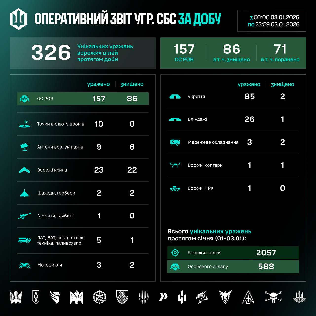 Over the course of January 3, units of the Unmanned Systems Forces grouping hit or destroyed 323 enemy targets.